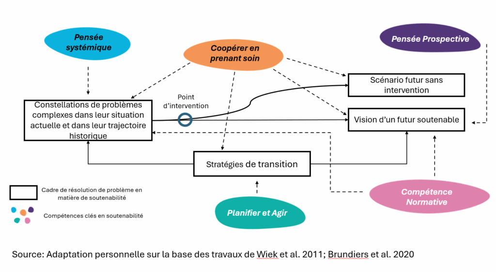 Le schéma ci-dessous représente le cadre théorique de résolution des problèmes en matière de soutenabilité et le rôle jouée par chacune des compétences du référentiel. Nous pouvons voir comment la démarche ou pensée systémique s’articule parmi les autres compétences clés du référentiel.